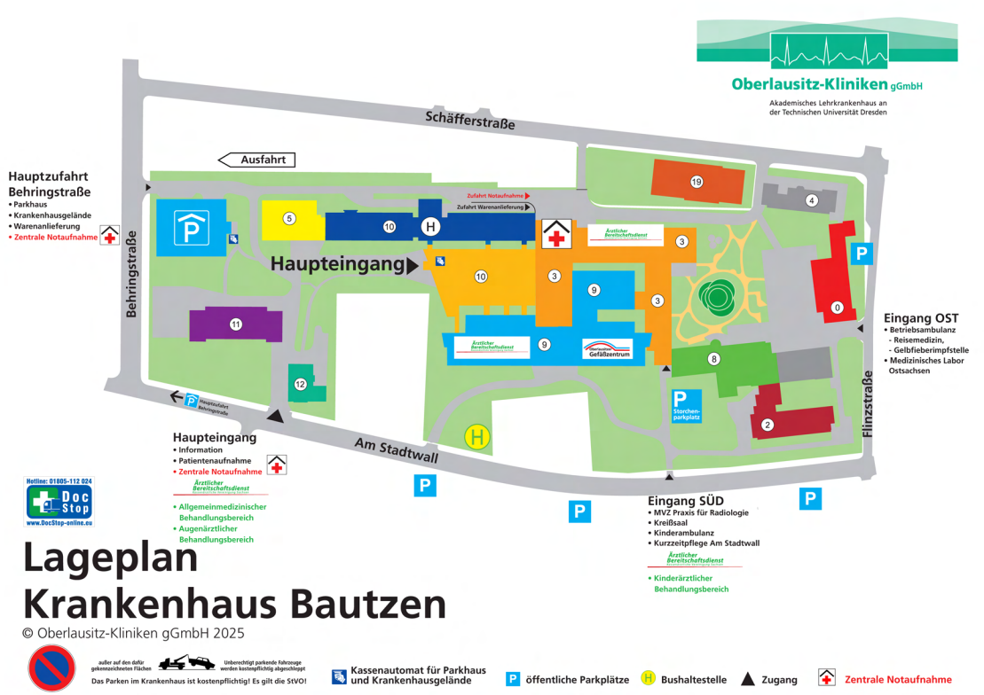 Der Campus der Oberlausitz Kliniken Bautzen ist zentral in Altstadtnähe gelegen und problemlos per Bus und Auto erreichbar. Auf dem Klinikgelände findet sich ein Gebüren-pflichtiges Parkhaus. Sie erreichen uns über die Rezeption am Haupteingang der Klinik (Haus 10). Unsere kardiologischen stationären und tagesklinischen Bettenstationen 4 und 6 finden sich im selben Komplex.